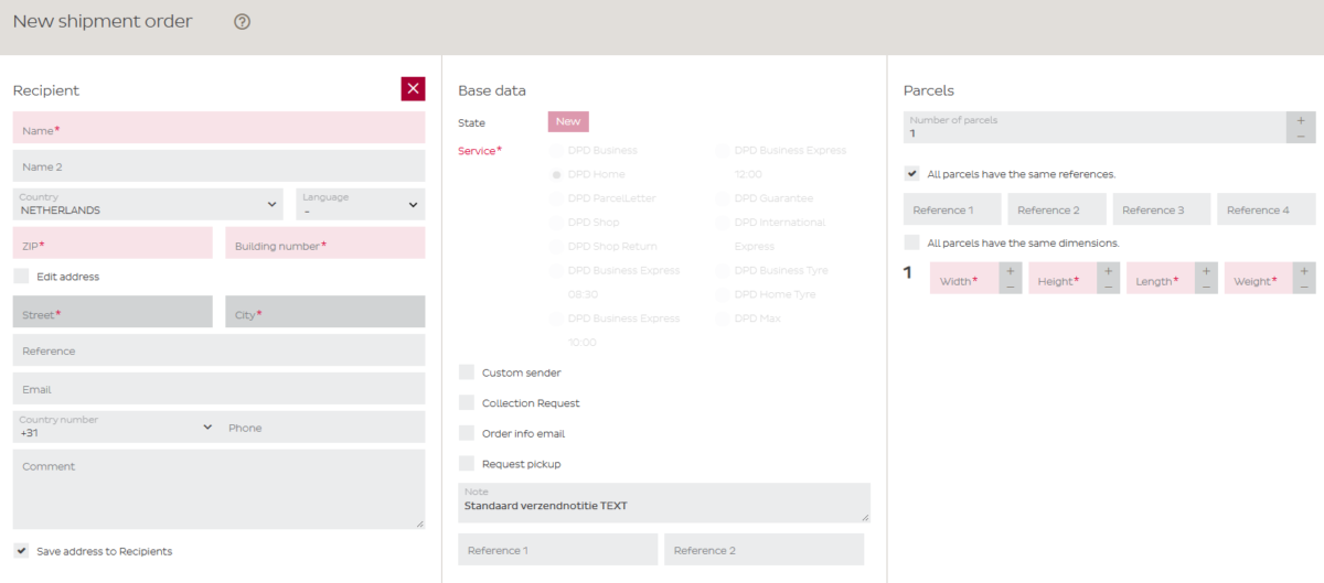 Important! Some fields in DPD Shipper are marked as optional while they must be filled mandatory. See all mandatory fields in this overview of mandatory fields.